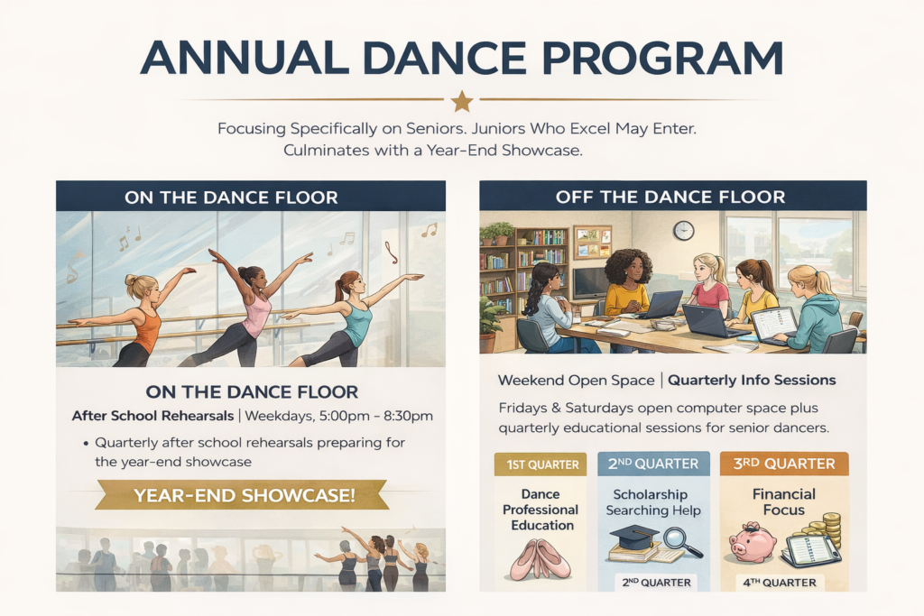 Programming centers on dance education, mentorship, and personal development. Dancers engage in structured classes, rehearsals, and reflective practices that emphasize discipline, resilience, and creative confidence. Dancers also are given cues to computers and networking opportunities to help prepare them for careers successfully.